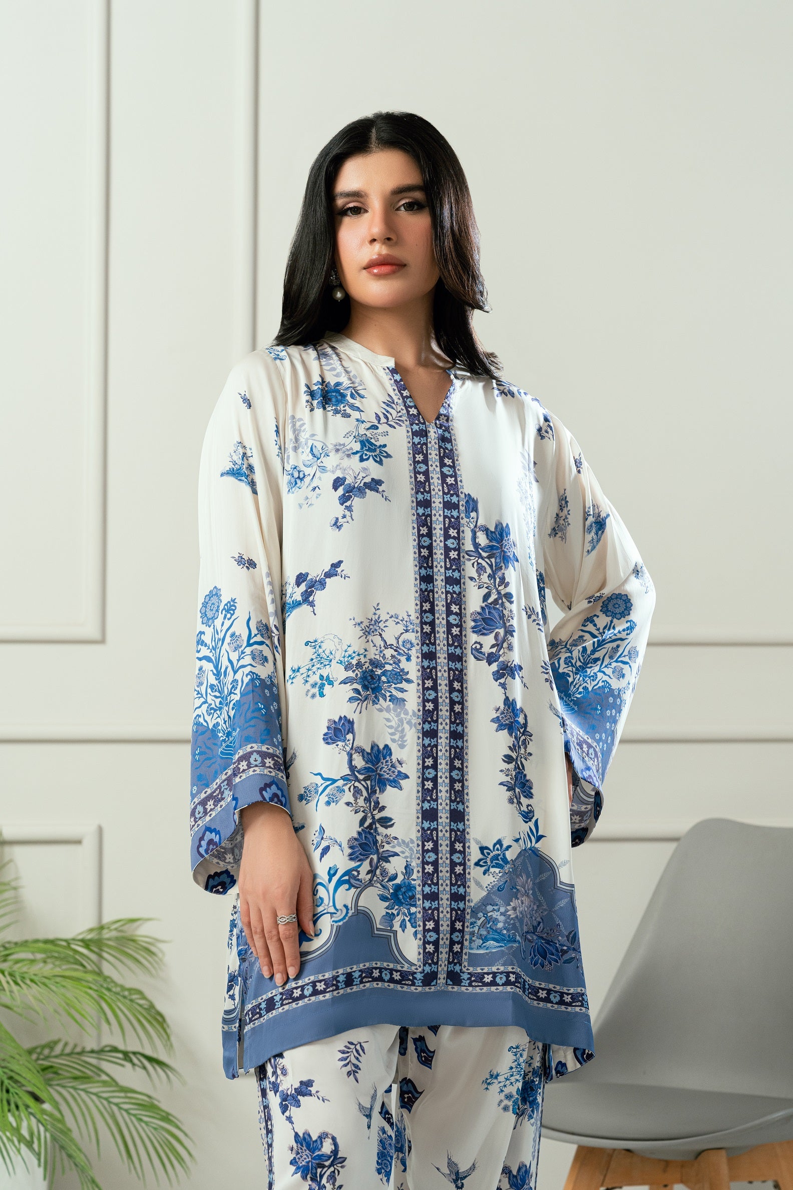 Ocean Bloom is a graceful 2-piece set in luxurious viscose charmeuse silk, featuring a soft ivory base adorned with serene blue floral and ornamental digital prints. Elegant yet comfortable, it’s perfect for both casual and semi-formal looks.